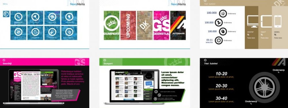 NewsMedia, known for websites such as Dumpert and GeenStijl, asked us to help them create a corporate presentation for their different brands. Seeing all of their brands have quite differtent brand guidelines, this posed a very nice challenge.