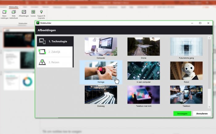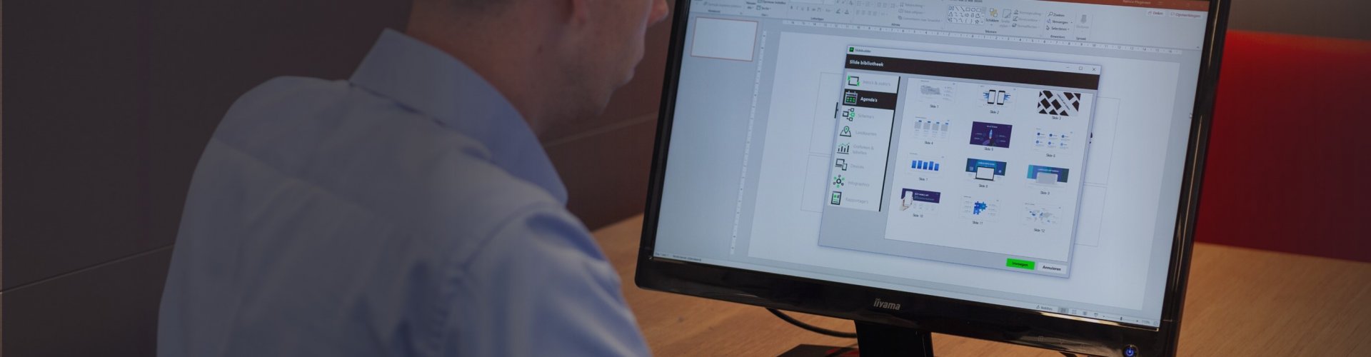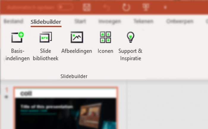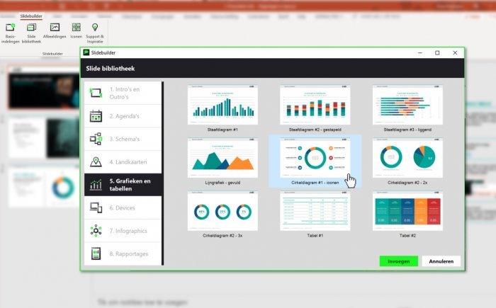 With Slidebuilder all employees will have immediate access within PowerPoint to the organization’s most often used slides. When you press the button “Slide library” a popup with various categories will be show. This way you can quickly search for the most common slides such as tables of content, graphs, tables, charts, schematics, maps, infographics, report slides and many more. Of course all slides are 100% styled according to your Corporate Identity.